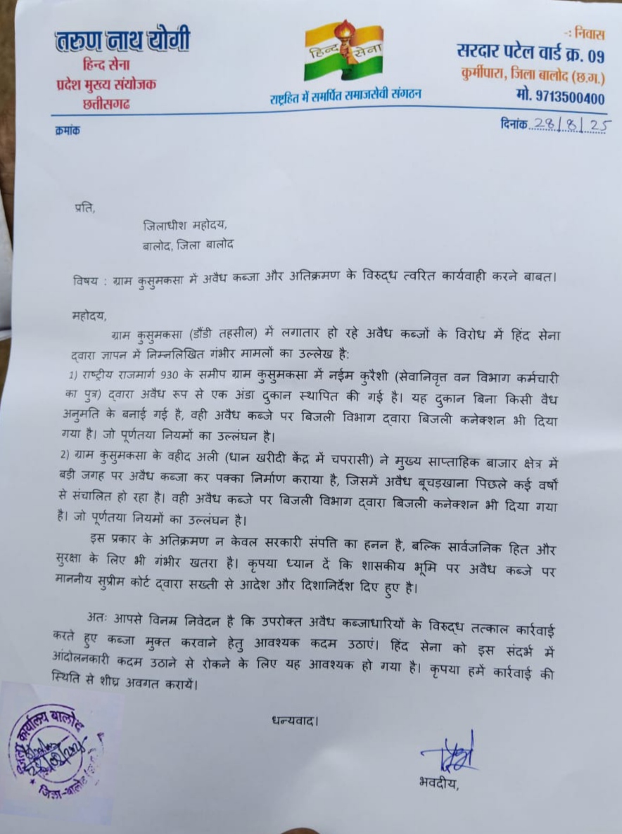 बालोद। जिले के डौंडी तहसील अंतर्गत ग्राम कुसुमकसा में सरकारी भूमि पर लगातार बढ़ रहे अवैध कब्जे और अतिक्रमण के मामले ने तूल पकड़ लिया है। हिन्द सेना के प्रदेश मुख्य संयोजक तरुण नाथ योगी ने बालोद कलेक्टर के नाम दिनांक 28 अगस्त 2025 को ज्ञापन सौंपा है कि ग्राम कुसुमकसा में अवैध कब्जा और अतिक्रमण के विरुद्ध त्वरित कार्यवाही की जाए। उन्होंने प्रस्तुत ज्ञापन में कहा है कि बालोद जिले में कई जगह शासकीय भूमि पर लगातार अवैध कब्जे हो रहे है जिसे स्थानीय प्रशासन नजरअंदाज कर रहा है। जिससे संबंधित अधिकारियों की लापरवाही की बात सामने आ रही है।आपको बता दें कि बालोद जिले के डौंडी तहसील अंतर्गत ग्राम कुसुमकसा (डौंडी तहसील) में लगातार हो रहे अवैध कब्जों के विरोध में हिंद सेना द्वारा आंदोलन की चेतावनी भी दी गई है। उन्होंने बताया कि कई स्थानों पर सरकारी जमीन पर अवैध कब्जे हो रहे हैं, जिन पर स्थानीय प्रशासन और संबंधित विभागों की लापरवाही स्पष्ट दिख रही है। आवश्यक कार्यवाही न होने की स्थिति में विभिन्न संगठनों द्वारा कानूनी एवं शांतिपूर्ण विरोध प्रदर्शन किया जा सकता है, जो प्रशासन की प्रतिष्ठा के लिए भी हानिकारक होगा।