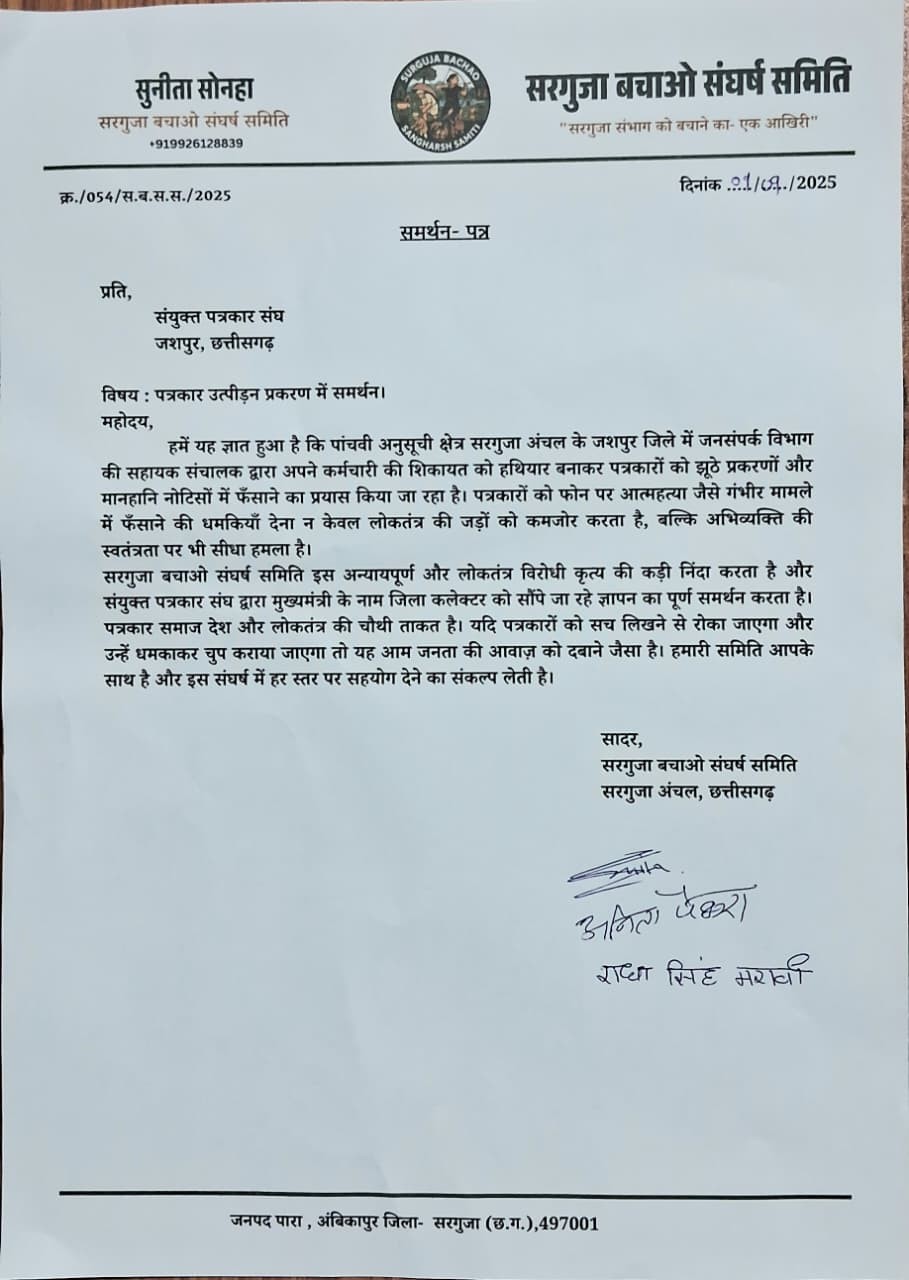 जशपुर। सत्ता और प्रशासन की मनमानी अब पत्रकारों को बर्दाश्त नहीं। सहायक संचालक जनसंपर्क जशपुर द्वारा पत्रकारों को अपराधी कहकर नोटिस भेजने की करतूत ने पूरे पत्रकार समाज को झकझोर दिया है। इस अपमानजनक कदम के विरोध में प्रदेश भर के पत्रकार एकजुट हो गए हैं।