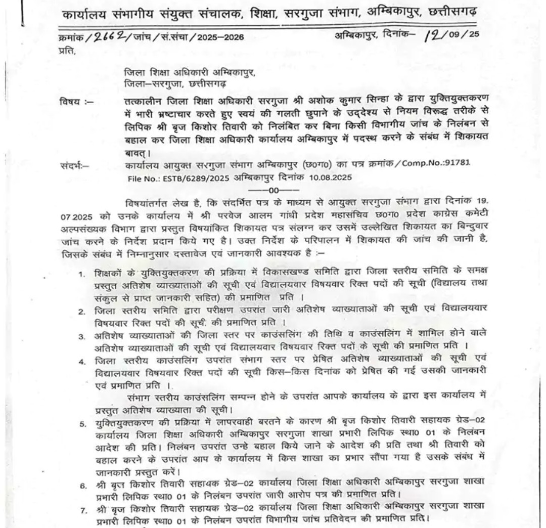 DEO अशोक सिन्हा पर सख्त जांच : सरगुजा के वर्तमान JD संजय गुप्ता ने 11 बिंदुओं पर जांच बिठाई है। हर बिंदु में मनमानी और अनियमितता की बू है।
