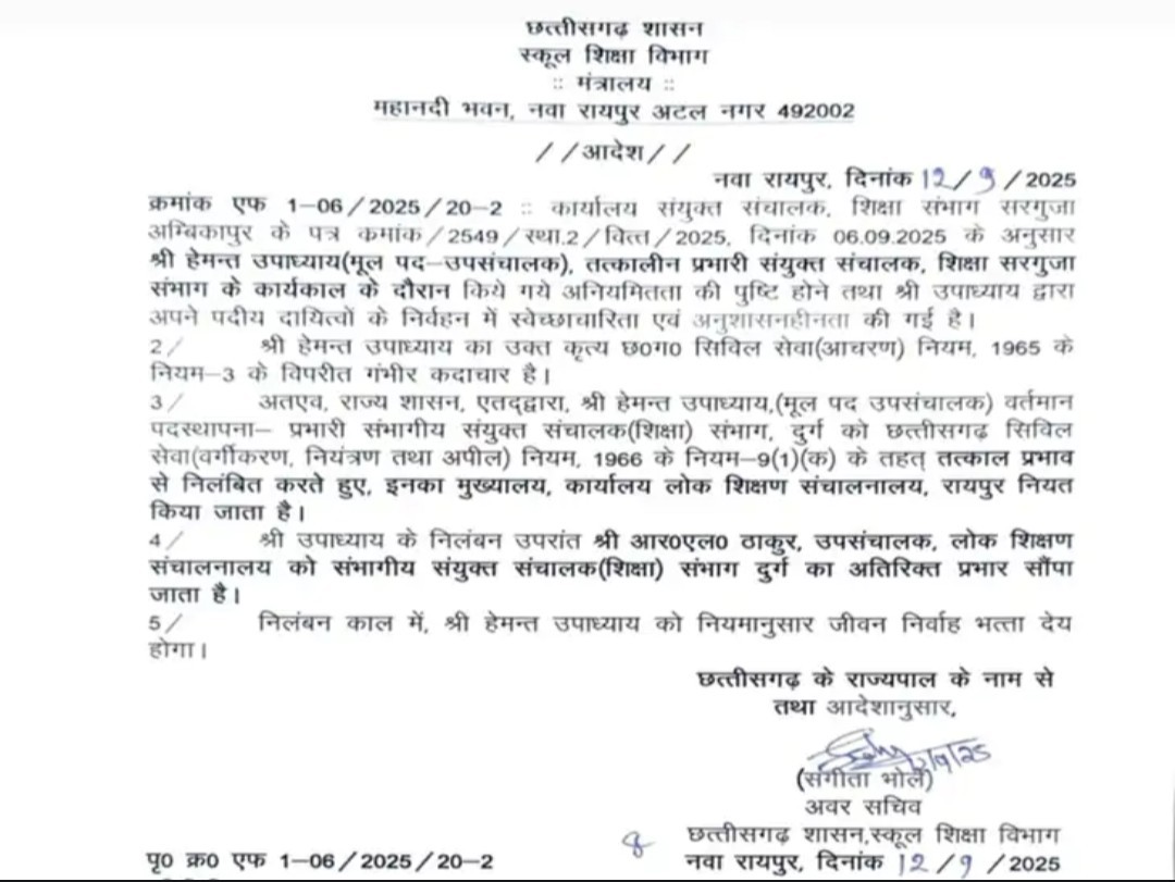 सरगुजा।छत्तीसगढ़ की शिक्षा व्यवस्था को खोखला कर रहे युक्तियुक्तकरण घोटाले ने अब बड़े अफसरों की कुर्सी हिला दी है। सरगुजा के तत्कालीन संयुक्त संचालक (JD) हेमंत उपाध्याय को शुक्रवार देर रात निलंबित कर दिया गया। वहीँ तत्कालीन जिला शिक्षा अधिकारी (DEO) अशोक सिन्हा पर भी शिकंजा कसना तय है।