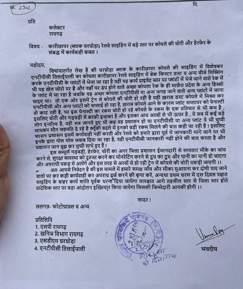 अरबों का खेल, सबकी मिलीभगत : ज्ञापन में कहा गया है कि एनटीपीसी तिलाईपाली सहित अन्य स्थानों से आने वाले कोयले को कारीछापर साइडिंग में जानबूझकर बेक फिल्टर डस्ट और घटिया सामग्री के साथ मिलाकर प्लांटों को भेजा जा रहा है। वहीं, असली और अच्छे दर्जे का कोयला यहां से निजी सौदों के जरिए प्रदेशभर के अन्य प्लांटों में सप्लाई किया जाता है।