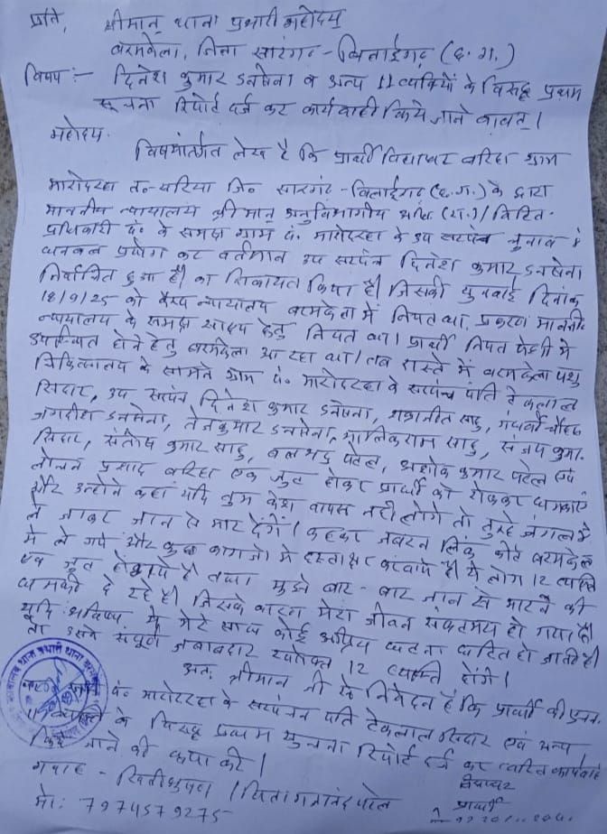 धमकियाँ और दबाव: जंगल तक ले जाने की कोशिश : शिकायतकर्ता ने बताया कि गुरुवार को वे एसडीएम न्यायालय में पेशी के लिए बरमकेला पहुँचे थे। इस दौरान उप सरपंच और उनके समर्थकों ने उनका पीछा किया, रास्ते में घेर लिया और डराकर केस वापस लेने का दबाव बनाया। आरोप है कि उन्हें जंगल ले जाने और जान से मारने की धमकी दी गई। साथ ही खाली कागजों पर जबरन हस्ताक्षर करवाए गए।