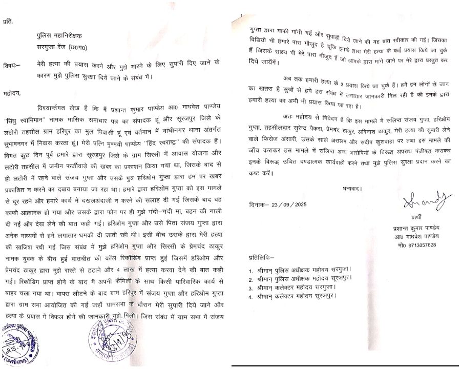 - आईजी सरगुजा रेंज को सौंपी गई शिकायत — सुरक्षा की गुहार