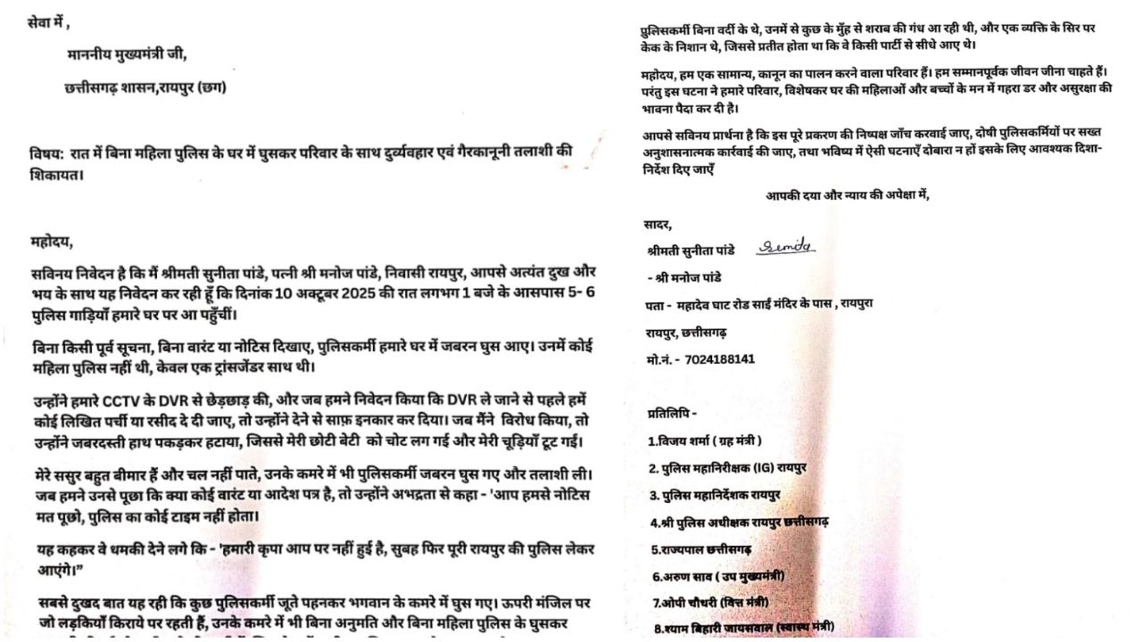 पत्रकार के घर रात में पुलिस की घुसपैठ : पत्रकार मनोज पांडे, संपादक – बुलंद छत्तीसगढ़, के घर रात 1:37 बजे पुलिस द्वारा गेट तोड़कर प्रवेश करने की घटना ने मामले को और गंभीर बना दिया है। परिवार की महिलाओं ने आरोप लगाया कि महिला पुलिसकर्मी मौजूद नहीं थीं, और सीसीटीवी कैमरे व डीवीआर जब्त कर लिए गए।