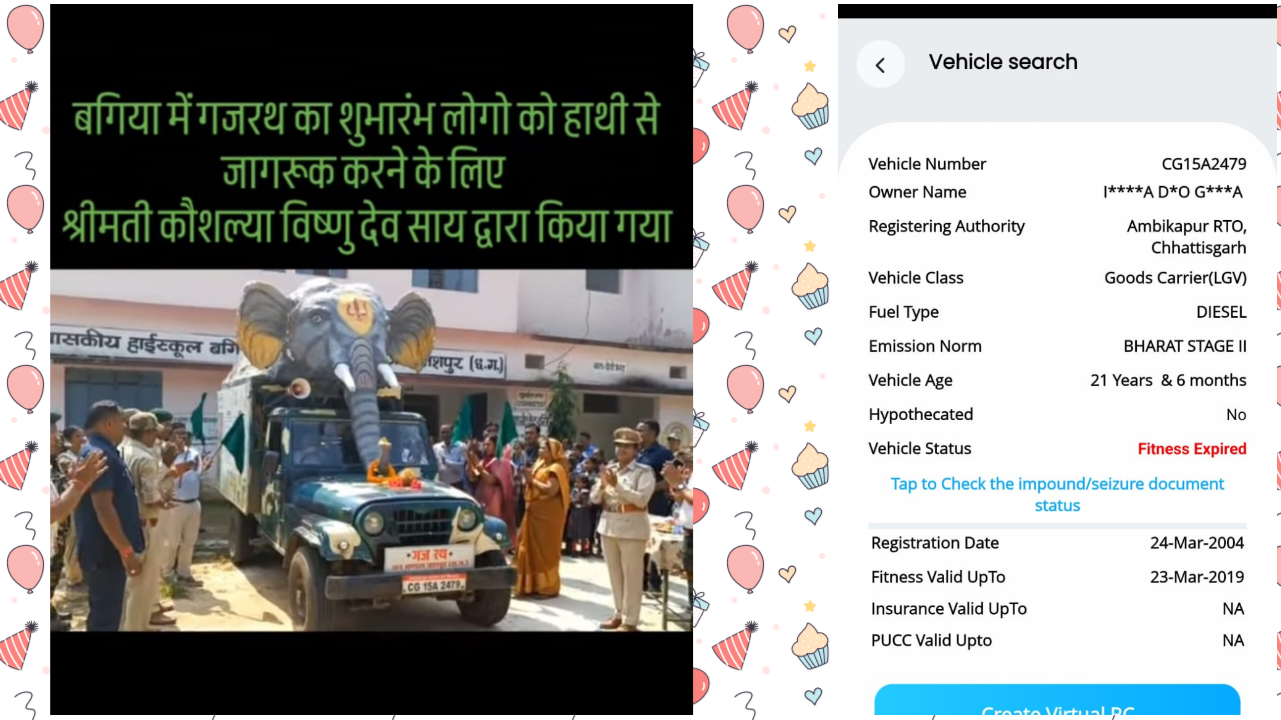 बताया जा रहा है कि इस ‘गजरथ’ का शुभारंभ पूर्व मंत्री एवं वर्तमान विधायक व मुख्यमंत्री विष्णुदेव साय जी की धर्मपत्नी श्रीमती कौशल्या विष्णुदेव साय द्वारा किया गया। मौके पर पुलिस, वन विभाग और स्कूल प्रबंधन के अधिकारी भी मौजूद थे, लेकिन किसी ने भी यह देखने की ज़हमत नहीं उठाई कि वाहन नंबर CG 15A 2478 न केवल पुराना है बल्कि फिटनेस और पंजीयन की वैधता भी समाप्त हो चुकी है।