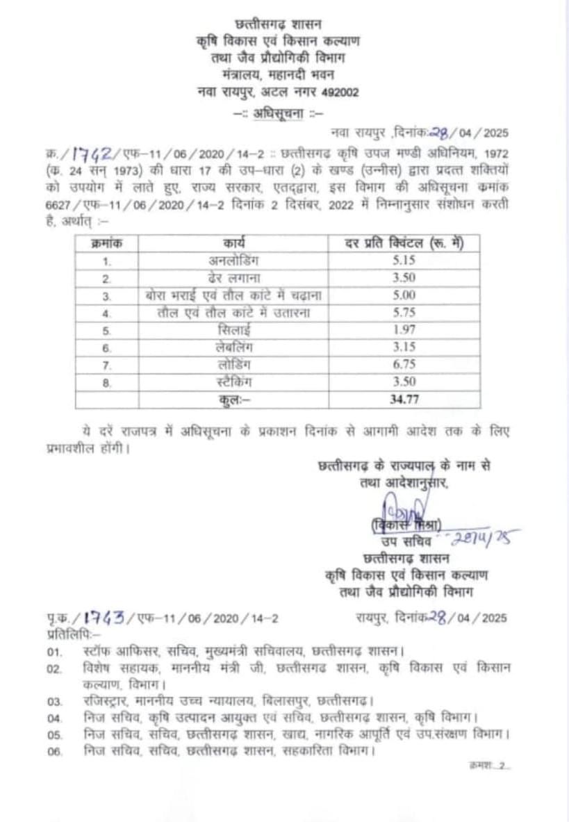 आदेश का असर : यह दरें छत्तीसगढ़ कृषि उपज मण्डी अधिनियम, 1972 के तहत जारी की गई हैं। अधिसूचना में साफ कहा गया है कि संशोधित दरें राजपत्र में प्रकाशन के साथ ही प्रभावी हो जाएंगी और आगामी आदेश तक लागू रहेंगी।