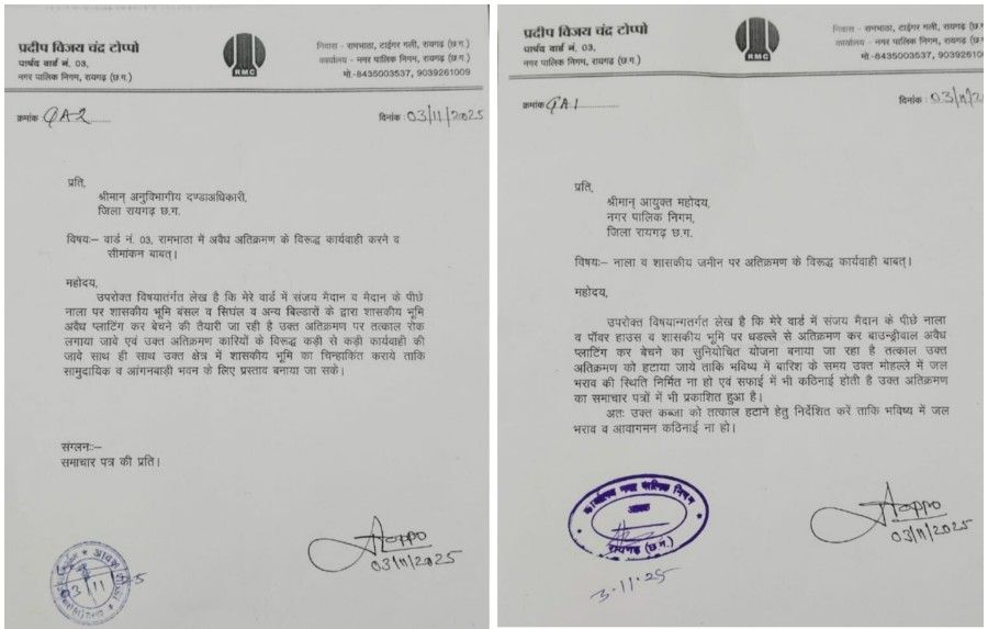 दूसरा पत्र: SDM रायगढ़ से सीमांकन और कार्रवाई की मांग : अपने दूसरे पत्र में पार्षद टोप्पो ने अनुविभागीय दंडाधिकारी रायगढ़ से कहा है कि “शासकीय भूमि और नाले पर बंसल, सिंगल व अन्य बिल्डरों द्वारा अवैध प्लॉटिंग की जा रही है। कृपया तत्काल सीमांकन कराया जाए, ताकि शासकीय भूमि की वास्तविक सीमा स्पष्ट हो सके।”