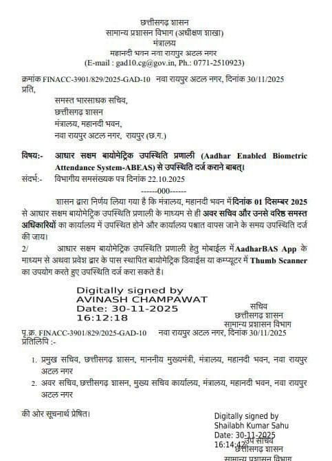 बड़ी खबर : छत्तीसगढ़ मंत्रालय में अफसरों की ‘लेटलतीफी’ पर लगाम! 1 दिसंबर (आज) से बायोमेट्रिक अटेंडेंस अनिवार्य… देखें आदेश…