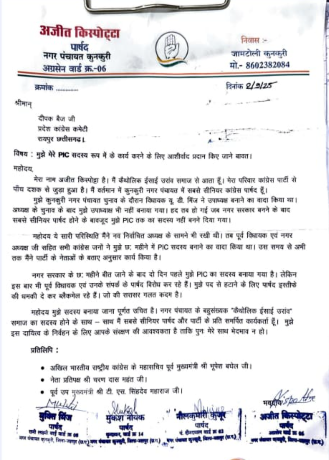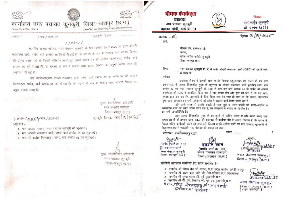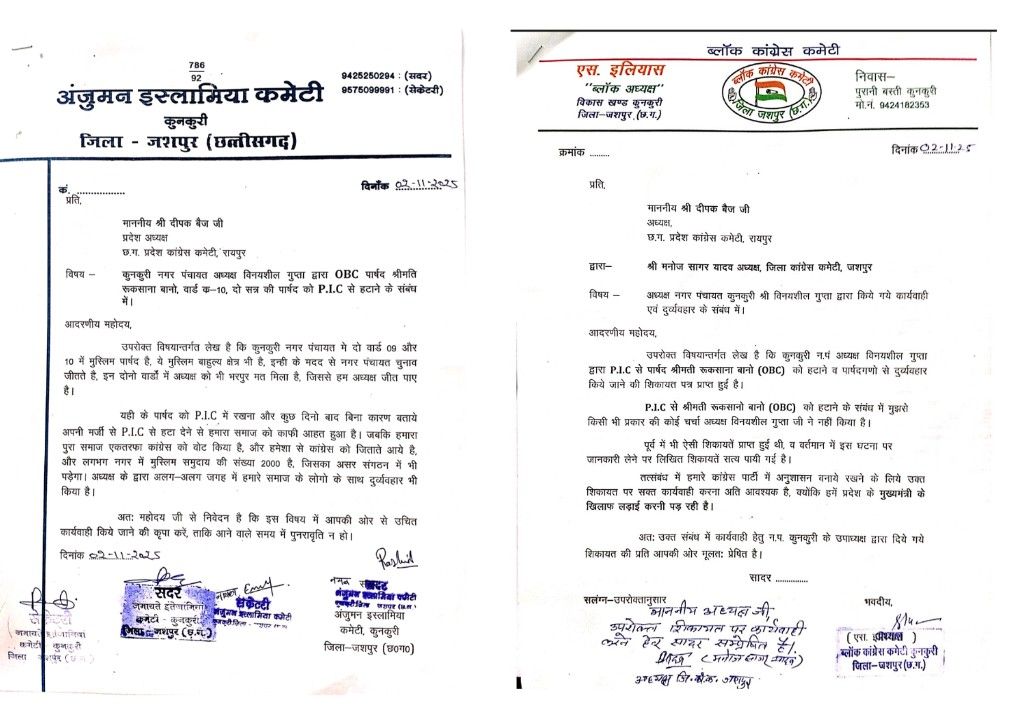 नगर पंचायत उपाध्यक्ष और पार्षदों ने भी जताई नाराज़गी : नगर पंचायत कुनकुरी के उपाध्यक्ष दीपक केरकेट्टा और पार्षद इमरान खान (वार्ड 9) ने भी इस निर्णय पर आपत्ति जताई है। दोनों जनप्रतिनिधियों ने कांग्रेस ब्लॉक अध्यक्ष को पत्र लिखते हुए कहा कि रुखसाना बानो को P.I.C. से हटाया जाना “पक्षपातपूर्ण और अनुचित” है।