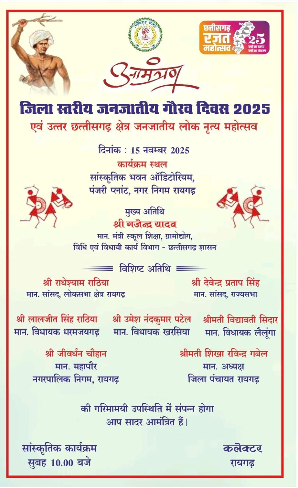 आयोजन सांस्कृतिक भवन ऑडिटोरियम, पंजरी प्लांट, नगर निगम रायगढ़ में होगा। कलेक्टर मयंक चतुर्वेदी ने बताया कि यह दिवस जनजातीय समाज की गौरवशाली विरासत, समृद्ध संस्कृति और योगदान को सम्मान देने का महत्वपूर्ण अवसर है।