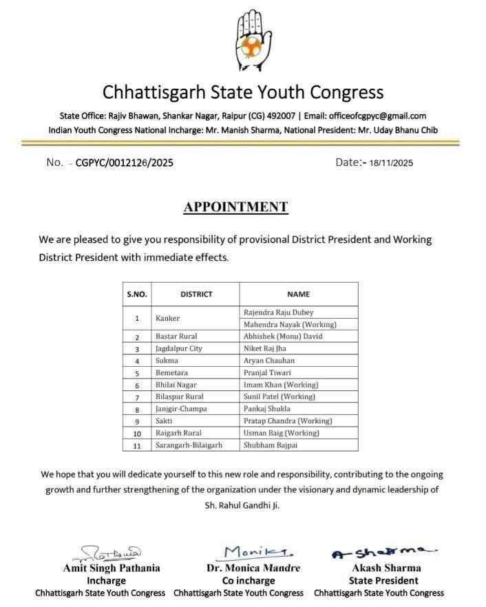 रायपुर। छत्तीसगढ़ युवा कांग्रेस ने संगठनात्मक मजबूती और जिलास्तरीय गतिविधियों को गति देने के उद्देश्य से राज्य के 11 जिलों में अस्थायी जिला अध्यक्ष एवं कार्यकारी (वर्किंग) जिला अध्यक्ष नियुक्त किए हैं। यह आदेश संगठन के इंचार्ज अमित सिंह पठानिया, को-इंचार्ज डॉ. मोनिका मांद्रे और राज्य अध्यक्ष आकाश शर्मा द्वारा जारी किया गया है।