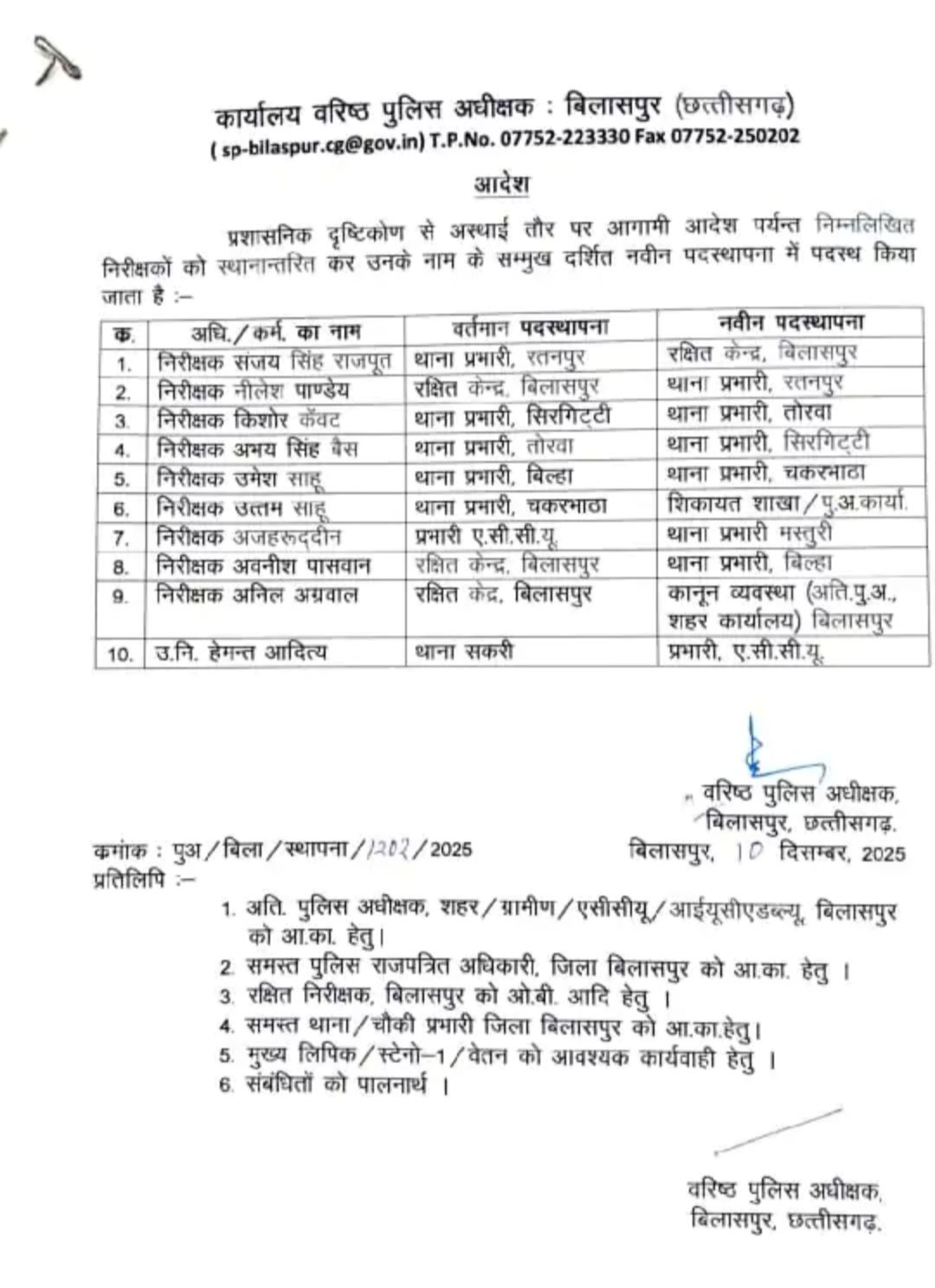 बिलासपुर पुलिस महकमे में बड़ा फेरबदल : SSP ने चलाया तबादला एक्सप्रेस, 9 निरीक्षक और 1 उप-निरीक्षक इधर से उधर, देखें पूरी लिस्ट…