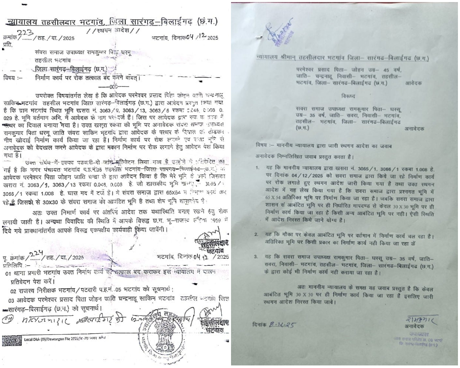 सारंगढ़–बिलाईगढ़। जिले में कानून का राज है या ‘रसूखदारों’ का जंगलराज? यह सवाल भटगांव में खड़ा हुआ है, जहाँ न्यायालय तहसीलदार का लिखित आदेश महज कागज का टुकड़ा बनकर रह गया है। मामला संवरा समाज द्वारा किए जा रहे निर्माण का है, जहाँ ‘स्टे ऑर्डर’ (स्थगन आदेश) के बावजूद धड़ल्ले से निर्माण जारी है और विरोध करने पर पीड़ित को मुख्यमंत्री निवास तक की धौंस दिखाई जा रही है।