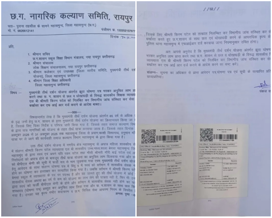 क्या है पूरा मामला? – छ.ग. नागरिक कल्याण समिति, रायपुर द्वारा की गई शिकायत के अनुसार, श्रीमती किरण पटेल, जो वर्तमान में शासकीय उच्च माध्यमिक शाला बेमचा (महासमुन्द) में ‘व्याख्याता एल बी’ के पद पर कार्यरत हैं, उन्होंने 27 अक्टूबर से 31 अक्टूबर 2025 के बीच आयोजित प्रयाग-काशी विश्वनाथ तीर्थ यात्रा का लाभ लिया। योजना के नियमों के अनुसार, कोई भी शासकीय सेवक या 60 वर्ष से कम आयु का व्यक्ति (विशेष परिस्थितियों को छोड़कर) इस योजना के लिए पात्र नहीं है।