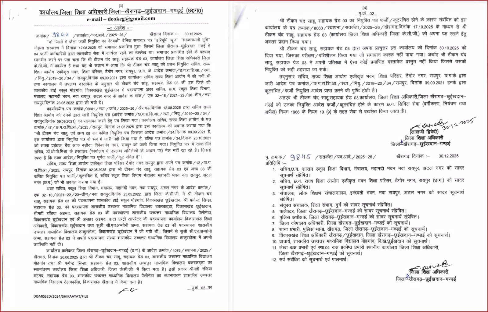 खैरागढ़-छुईखदान-गंडई। शिक्षा विभाग में फर्जी नियुक्तियों के खिलाफ प्रशासन ने अब तक की सबसे बड़ी कार्रवाई की है। जिला शिक्षा अधिकारी (DEO) खैरागढ़ ने ‘फर्जी नियुक्ति पत्र’ के आधार पर सरकारी सेवा का लाभ ले रहे सहायक ग्रेड-03 श्री टीकम चंद साहू को तत्काल प्रभाव से सेवा से बर्खास्त कर दिया है। यह कार्रवाई छत्तीसगढ़ सिविल सेवा नियम 1966 के तहत की गई है।