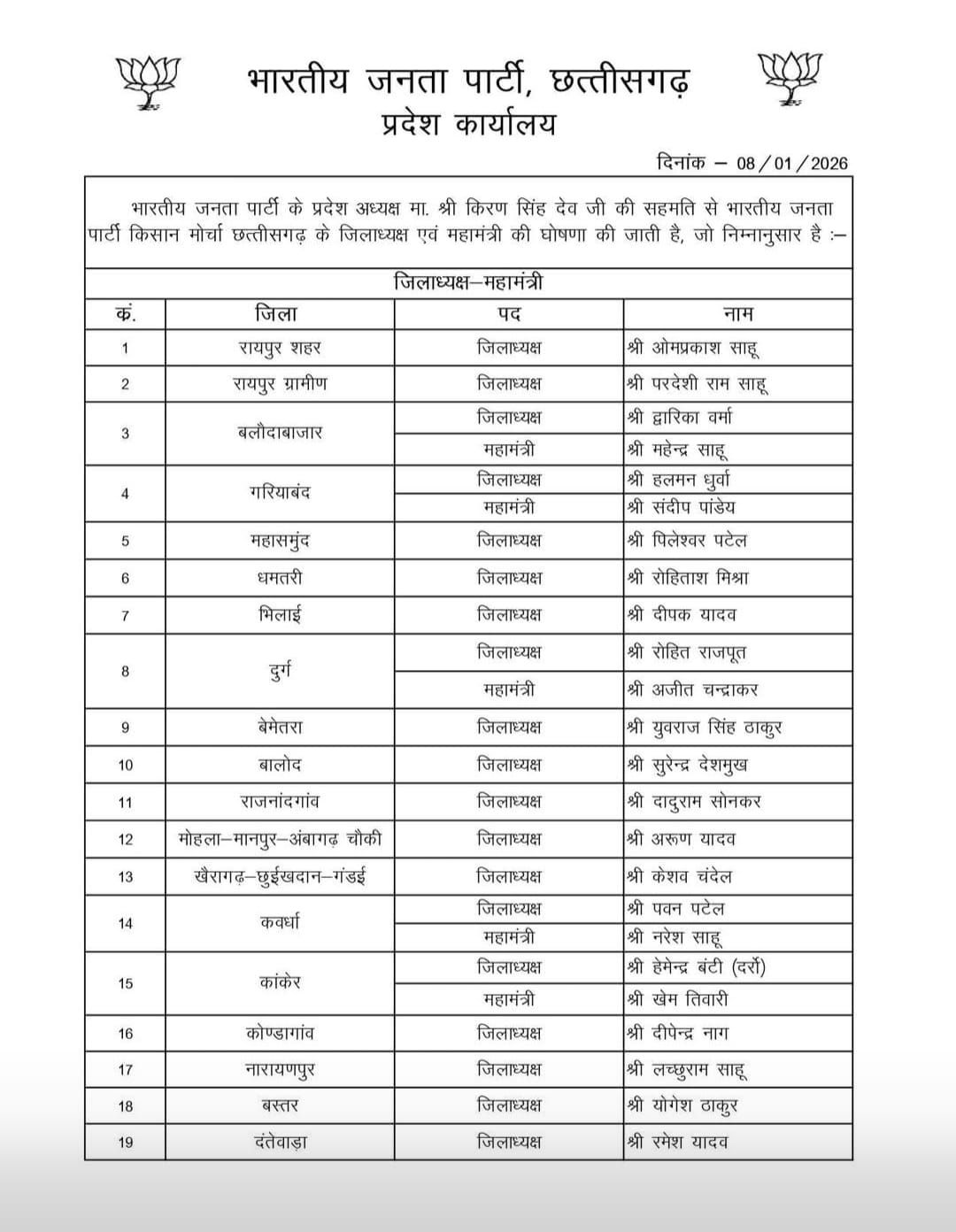 बड़ी खबर: छत्तीसगढ़ बीजेपी किसान मोर्चा में भारी फेरबदल, जिलों के अध्यक्ष और महामंत्रियों की सूची जारी; देखें सूची…