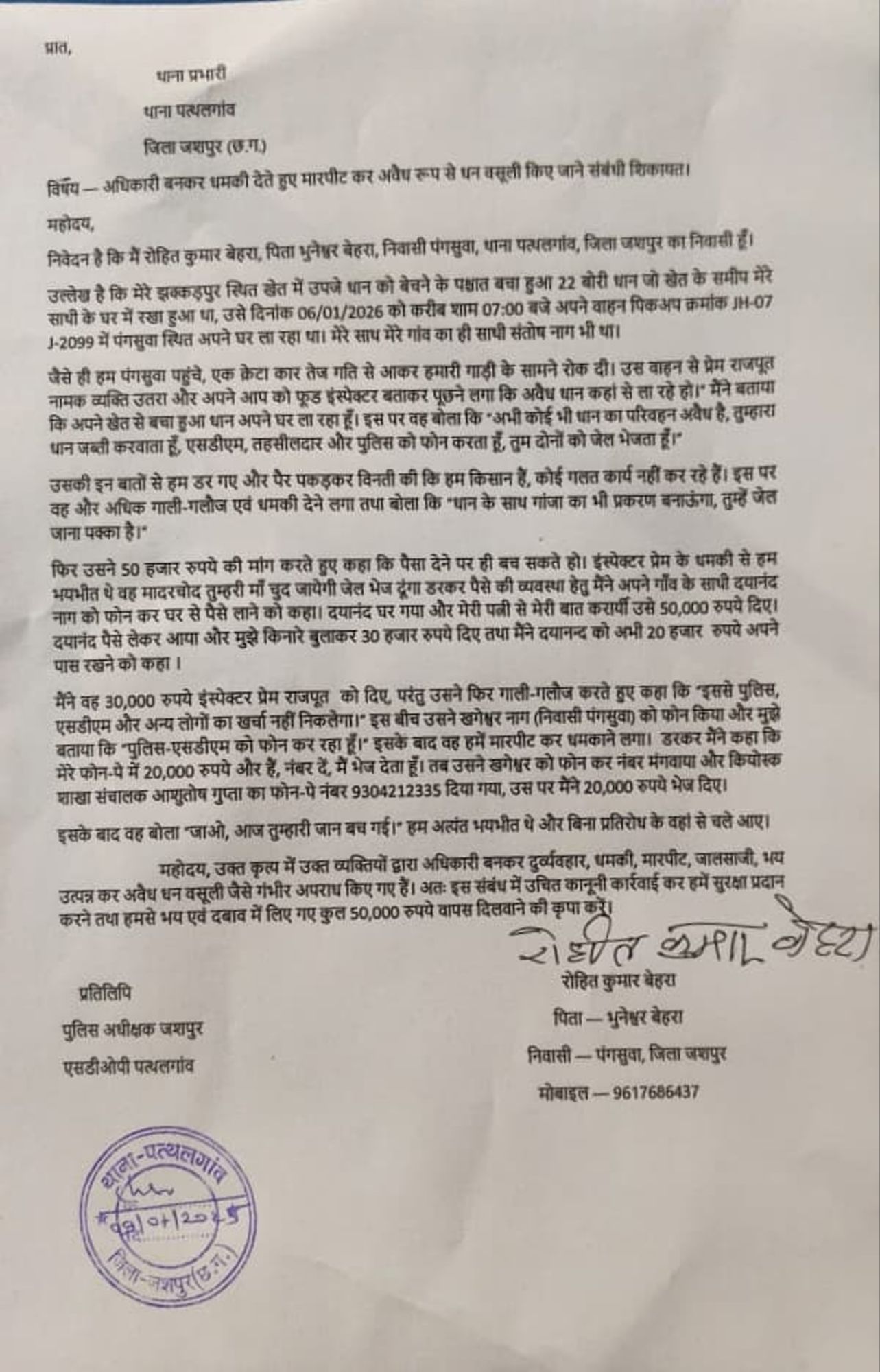न्याय की गुहार :पैसे लूटने के बाद आरोपी ने किसान को यह कहते हुए छोड़ा कि “आज तुम्हारी जान बच गई।” इस घटना से पीड़ित किसान और उसका परिवार गहरे सदमे में है। रोहित कुमार बेहरा ने पुलिस अधीक्षक जशपुर और एसडीओपी पत्थलगांव को पत्र लिखकर अपनी सुरक्षा की मांग की है और लुटे गए 50,000 रुपये वापस दिलाने व दोषियों पर कड़ी कार्रवाई करने की अपील की है।