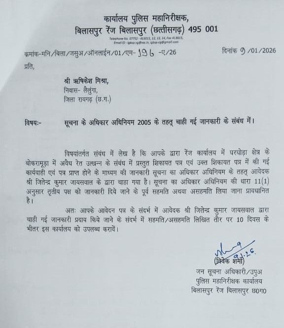 RTI से डर क्यों? क्या छुपा रही है पुलिस? – मामला पोरफोड़ा (पोकरामुड़ा) क्षेत्र का है, जहाँ बड़े पैमाने पर अवैध रेत उत्खनन की शिकायतें हुई थीं। जब निर्भीक पत्रकार जितेंद्र कुमार जायसवाल ने इस पर हुई कार्रवाई का कच्चा चिट्ठा (शिकायती पत्र और एक्शन रिपोर्ट) RTI के जरिए मांगा, तो विभाग ने सीधे जानकारी देने के बजाय ‘धारा 11(1)’ का दांव खेल दिया। प्रशासन ने इसे ‘तृतीय पक्ष’ की जानकारी बताकर मामले को ठंडा करने की कोशिश की।