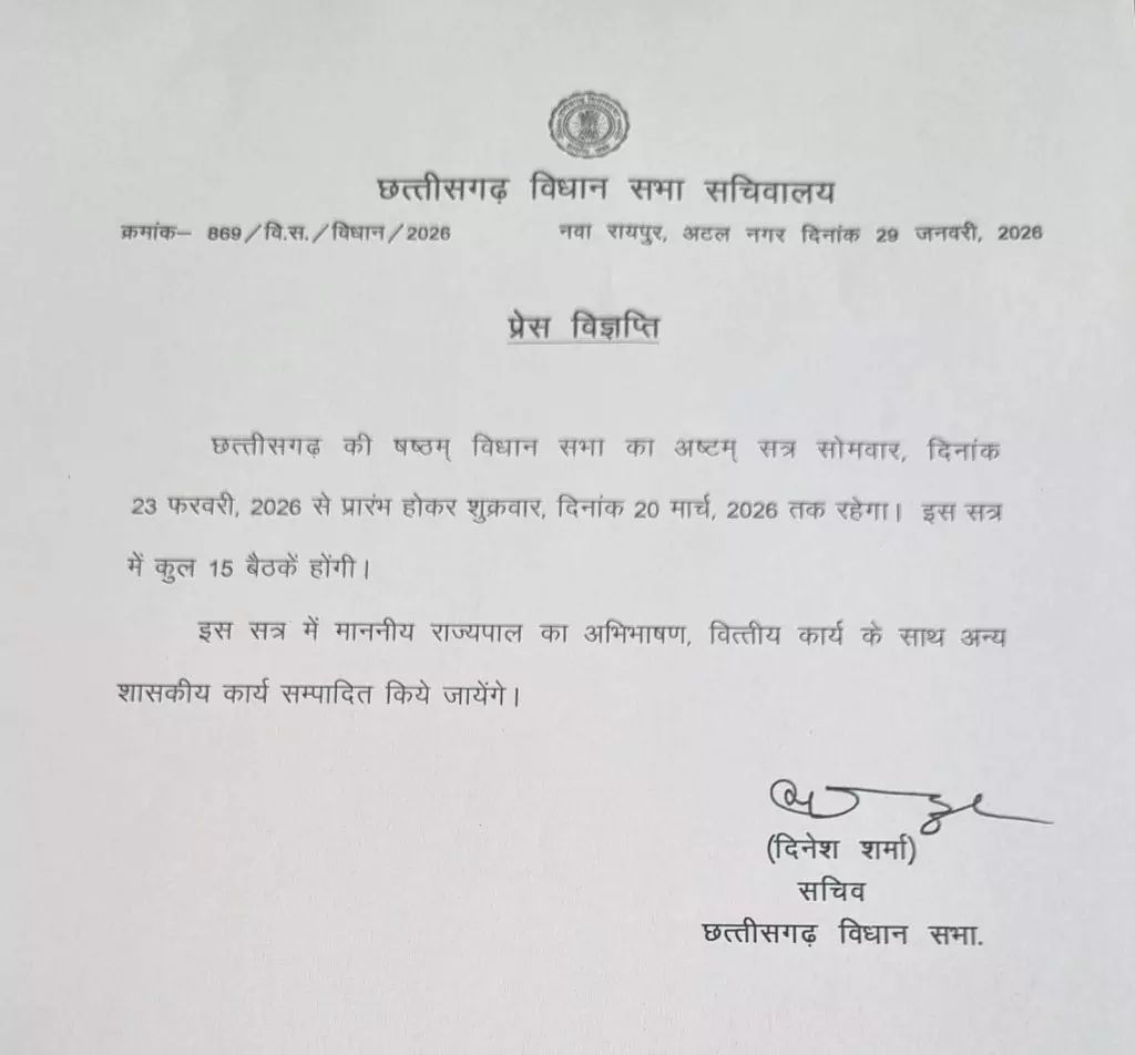 रायपुर। छत्तीसगढ़ की सियासत में हलचल तेज होने वाली है। छत्तीसगढ़ विधानसभा के आगामी अष्टम् सत्र (बजट सत्र) की आधिकारिक घोषणा कर दी गई है। विधानसभा सचिवालय द्वारा जारी अधिसूचना के अनुसार, छटवीं विधानसभा का यह महत्वपूर्ण सत्र 23 फरवरी 2026 से शुरू होकर 20 मार्च 2026 तक चलेगा।