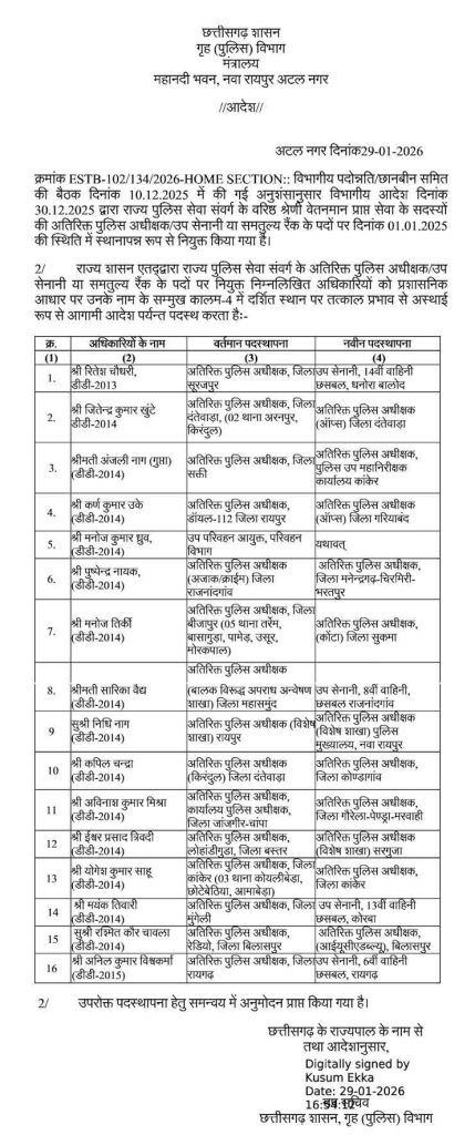 नवा रायपुर: छत्तीसगढ़ शासन के गृह (पुलिस) विभाग ने राज्य पुलिस सेवा (SPS) संवर्ग के अधिकारियों के लिए एक बड़ा फेरबदल आदेश जारी किया है। विभाग द्वारा जारी नवीनतम सूची के अनुसार, 16 अतिरिक्त पुलिस अधीक्षक (ASP) और उप सेनानी स्तर के अधिकारियों को तत्काल प्रभाव से नई पदस्थापना दी गई है। यह आदेश महानदी भवन, नवा रायपुर से आज 29 जनवरी 2026 को जारी किया गया।