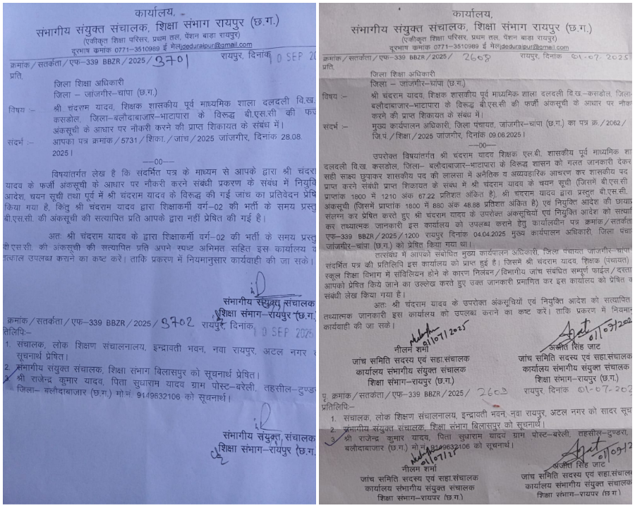 दोहरा खेल: जॉइनिंग और नियुक्ति में अलग-अलग दस्तावेज – जिला शिक्षा अधिकारी (DEO) जांजगीर-चांपा द्वारा प्रेषित प्रतिवेदन ने शिक्षक की चतुराई की पोल खोल दी है। जांच समिति ने पाया कि नियुक्ति के समय और कार्यभार ग्रहण (जॉइनिंग) करते समय अलग-अलग अंकसूचियों की फोटोकॉपी जमा की गई थी। यह विसंगति चीख-चीख कर कह रही है कि यह महज मानवीय त्रुटि नहीं, बल्कि सुनियोजित धोखाधड़ी है।