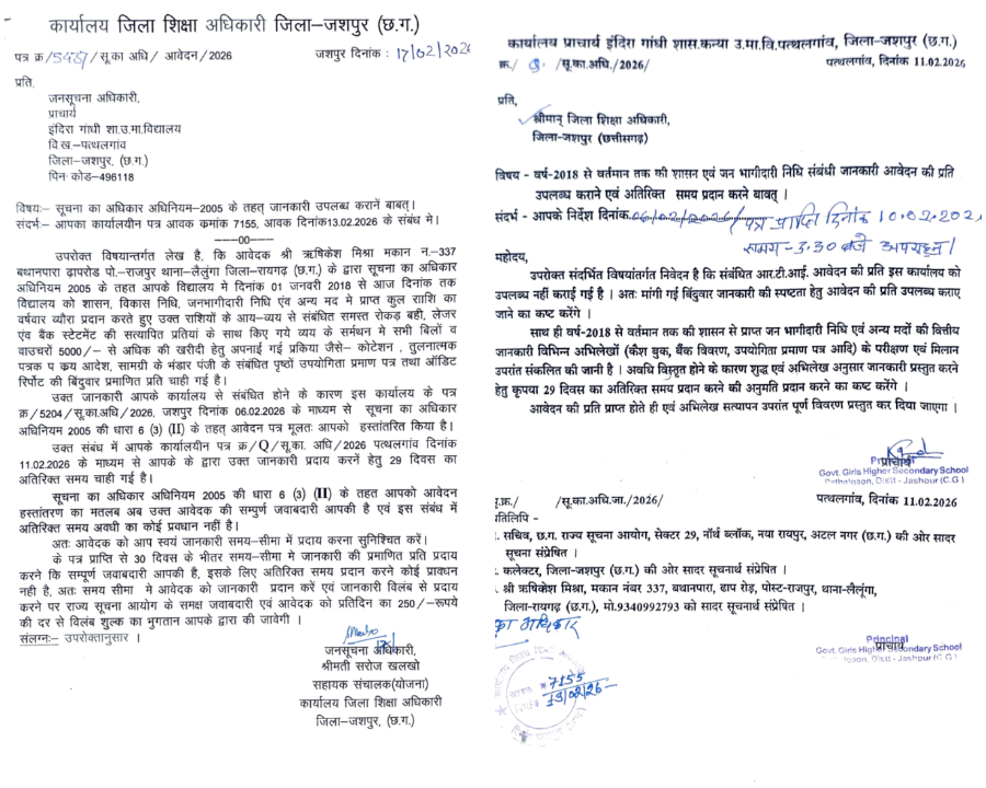 जशपुर। सूचना के अधिकार अधिनियम (RTI) की धज्जियां उड़ाते हुए पत्थलगांव का एक सरकारी विद्यालय अब राज्य सूचना आयोग के निशाने पर आ सकता है। इंदिरा गांधी शासकीय कन्या उच्च माध्यमिक विद्यालय के प्राचार्य द्वारा जानकारी देने के बदले 29 दिन का ‘अतिरिक्त समय’ मांगने की अजीबोगरीब मांग पर जिला शिक्षा अधिकारी (DEO) ने कड़ा रुख अपनाया है। DEO ने स्पष्ट किया है कि RTI में अतिरिक्त समय का कोई प्रावधान नहीं है और देरी होने पर 250 रुपये प्रतिदिन का जुर्माना प्राचार्य को अपनी जेब से भरना होगा।