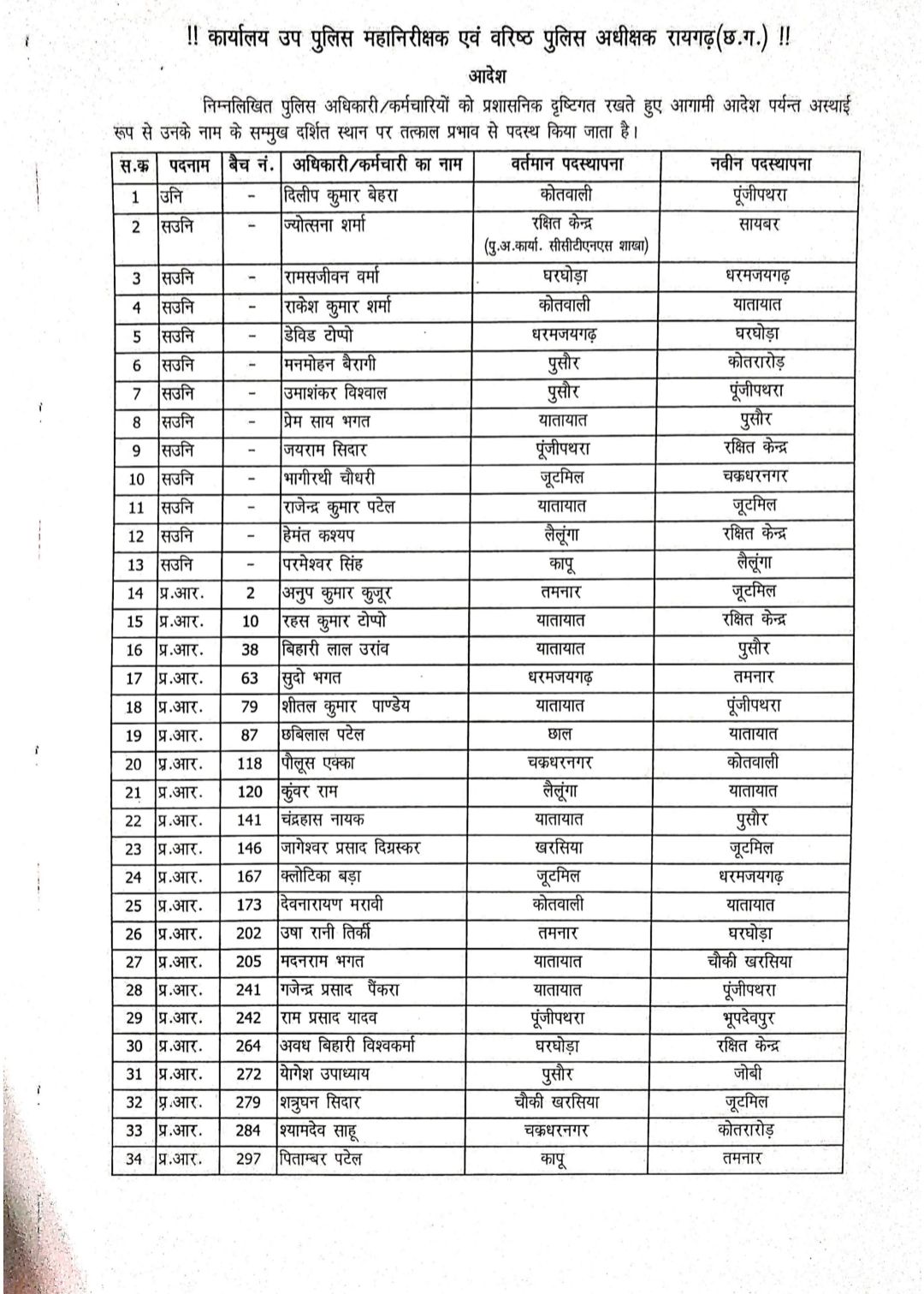 ​जारी आदेश के अनुसार, इस फेरबदल में उपनिरीक्षक (SI), सहायक उपनिरीक्षक (ASI), प्रधान आरक्षक और आरक्षकों को इधर से उधर किया गया है।