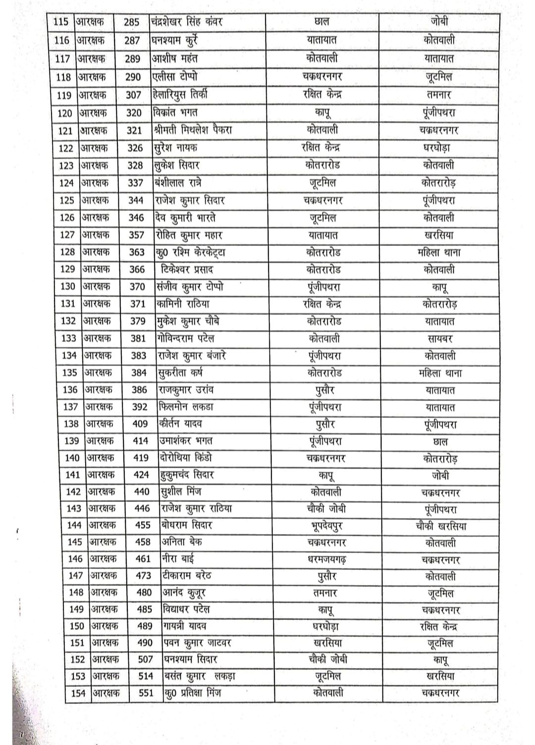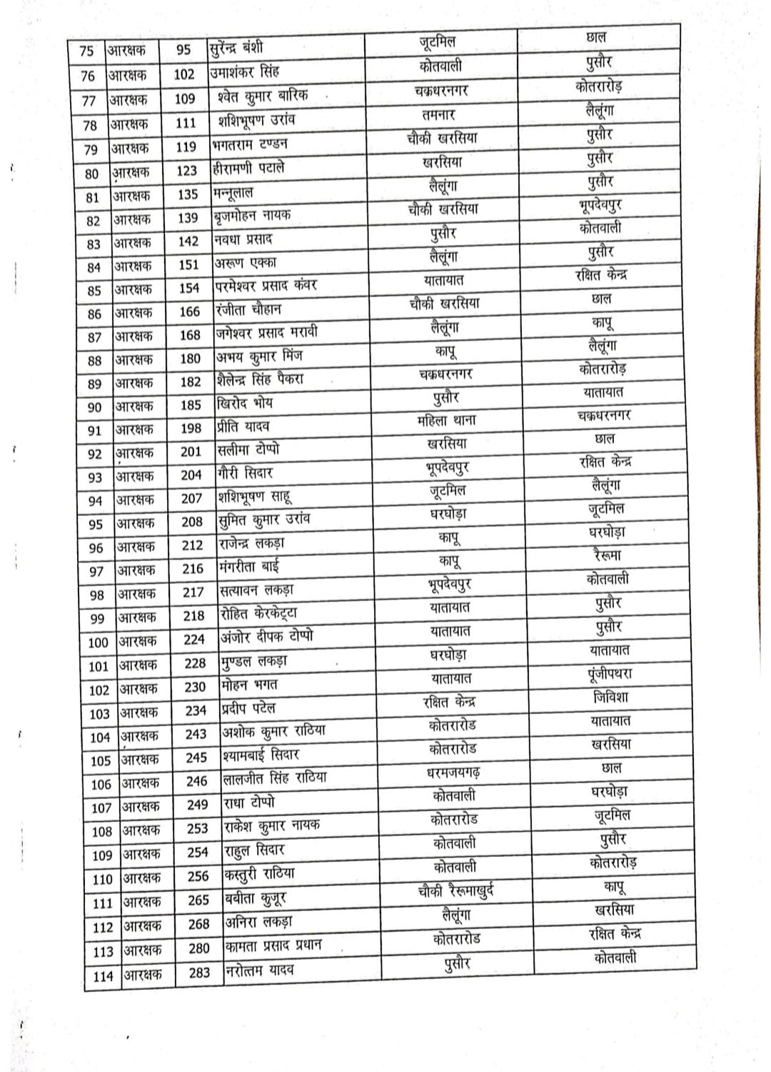 • मैदानी थानों में नई ऊर्जा : ग्रामीण और दूरस्थ इलाकों जैसे कापू, लैलूंगा और धरमजयगढ़ के पुलिसकर्मियों को शहरी क्षेत्रों और रक्षित केंद्र भेजा गया है, जबकि शहर में जमे जवानों को फील्ड की जिम्मेदारी दी गई है।