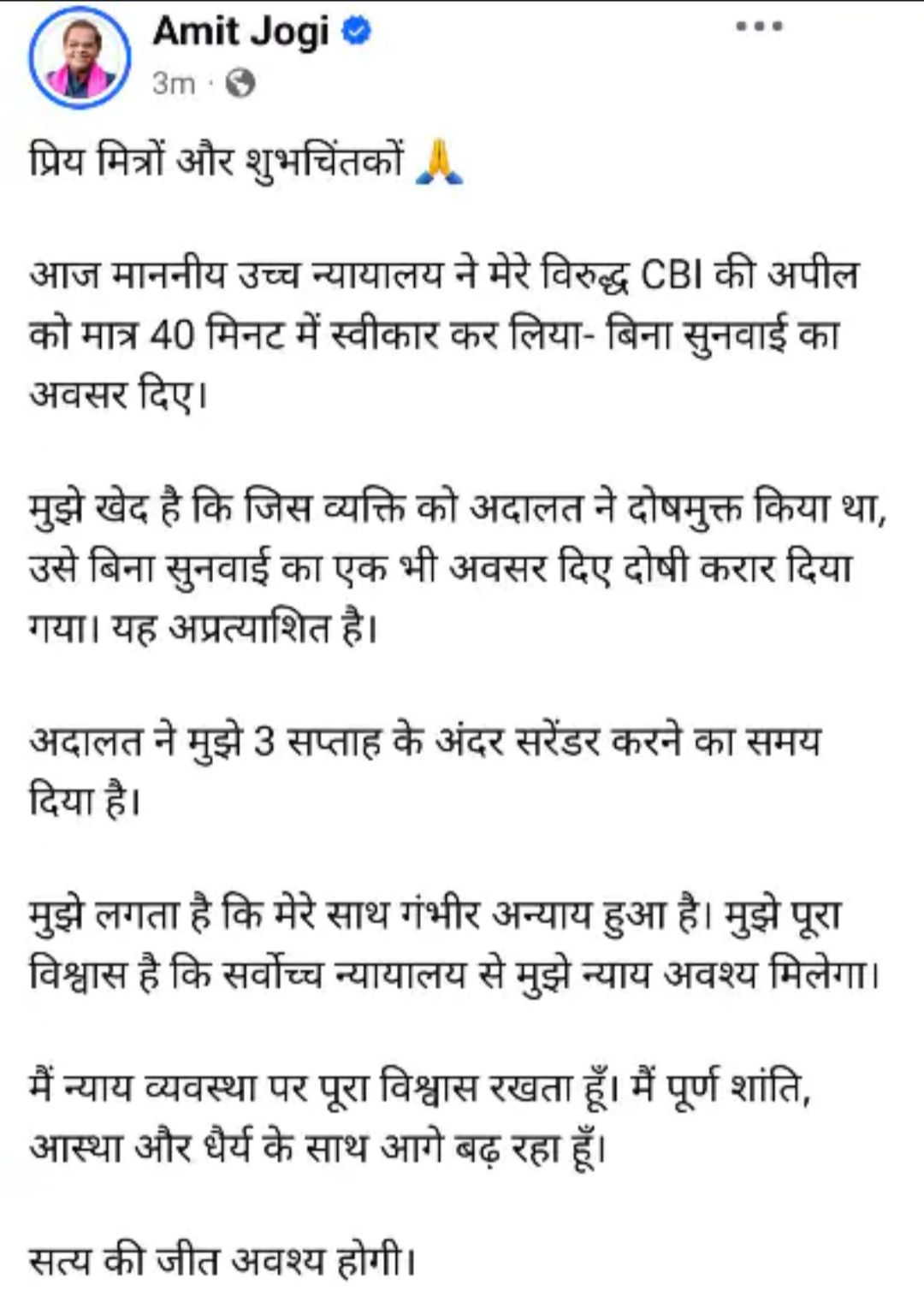 बिलासपुर। छत्तीसगढ़ के बहुचर्चित और दो दशक पुराने राम अवतार जग्गी हत्याकांड में न्यायपालिका ने एक अत्यंत महत्वपूर्ण निर्णय सुनाया है। बिलासपुर उच्च न्यायालय की डिवीजन बेंच ने मामले की संवेदनशीलता और उपलब्ध तथ्यों को ध्यान में रखते हुए मुख्य आरोपी रहे अमित जोगी को तीन सप्ताह के भीतर संबंधित न्यायालय में आत्मसमर्पण करने का आदेश दिया है।