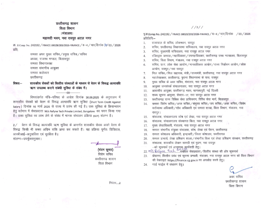 नवा रायपुर। छत्तीसगढ़ शासन के वित्त विभाग ने राज्य के लाखों शासकीय सेवकों को बड़ी सौगात देते हुए ‘वेतन के विरुद्ध अल्पावधि ऋण’ (Short Term Credit Against Salary) योजना की शुरुआत की है। मंत्रि-परिषद के निर्णय के अनुपालन में यह सुविधा 16 मार्च 2026 से पूरे राज्य में प्रभावी हो गई है। अब कर्मचारी अपनी वित्तीय जरूरतों के लिए अपनी सैलरी का एडवांस हिस्सा आसानी से प्राप्त कर सकेंगे।