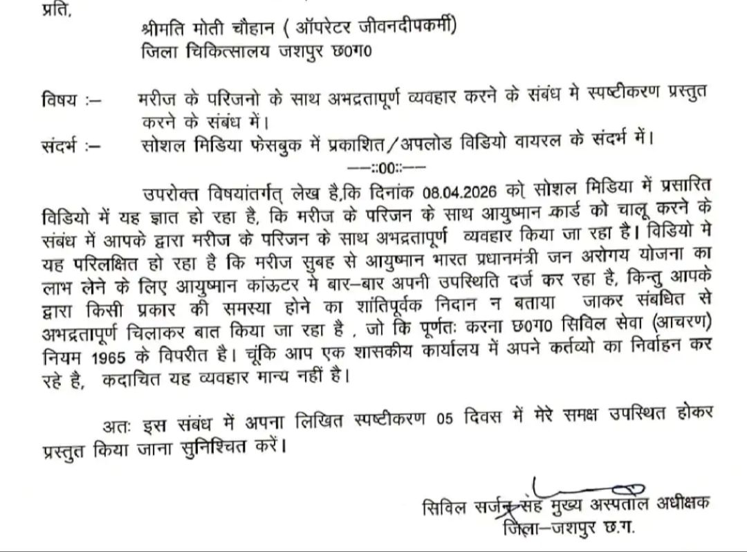 जशपुर। सरकारी अस्पतालों में मरीजों और उनके परिजनों के साथ होने वाला दुर्व्यवहार अब बर्दाश्त नहीं किया जाएगा। जशपुर जिला चिकित्सालय से एक ऐसा ही मामला सामने आया है, जहाँ आयुष्मान कार्ड काउंटर पर तैनात ऑपरेटर मोती चौहान द्वारा परिजनों से अभद्रता करने का वीडियो सोशल मीडिया पर वायरल हो गया। मामले की गंभीरता को देखते हुए सिविल सर्जन सह मुख्य अस्पताल अधीक्षक ने कड़ा रुख अपनाते हुए ऑपरेटर को ‘कारण बताओ नोटिस’ थमा दिया है।