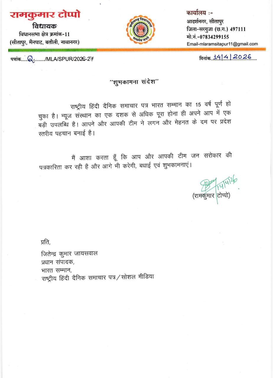 सरगुजा। निर्भीक पत्रकारिता और जनता की बुलंद आवाज़ बन चुके राष्ट्रीय हिंदी दैनिक समाचार पत्र ‘भारत सम्मान’ की गूँज अब सत्ता के गलियारों में साफ सुनाई दे रही है। संस्थान के सफल 15 वर्ष पूर्ण होने पर सीतापुर विधानसभा क्षेत्र (क्रमांक-11) के लोकप्रिय विधायक रामकुमार टोप्पो ने पत्र लिखकर अपनी हार्दिक शुभकामनाएँ प्रेषित की हैं।