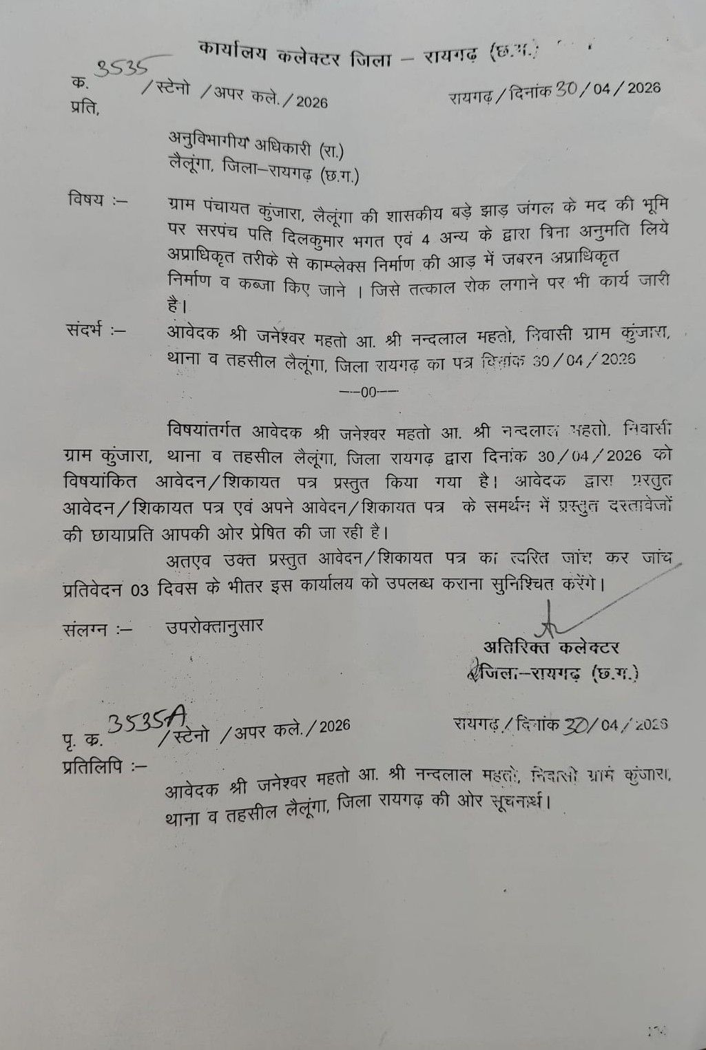 कलेक्टर का 72 घंटे का अल्टीमेटम : मामले की गूंज अब रायगढ़ कलेक्टर कार्यालय के गलियारों में है। 30 अप्रैल 2026 को आवेदन मिलने के तुरंत बाद, अपर कलेक्टर ने एसडीएम लैलूंगा को आदेश जारी कर 3 दिन के भीतर जांच प्रतिवेदन मांगा है。 प्रशासन ने स्पष्ट किया है कि यदि निर्माण नहीं रोका गया, तो यह शासन की संपत्ति और सार्वजनिक हित का बड़ा नुकसान होगा。