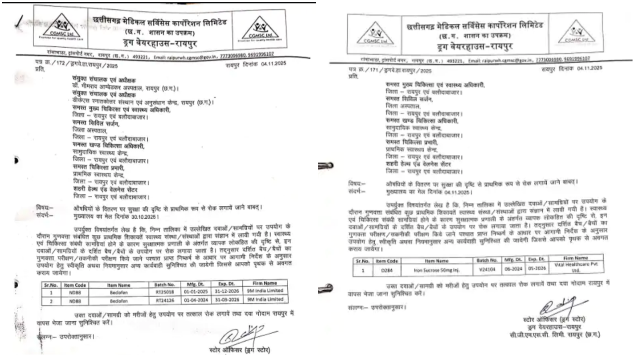 दूसरा मामला – बिलासपुर में मरीज को साइड इफेक्ट : रीजनल ड्रग वेयरहाउस बिलासपुर से आपूर्ति की गई आयरन सुक्रोज 100 एमजी इंजेक्शन (Drug Code – D285, Batch No. V24104) के उपयोग के बाद पीएचसी बंधवापारा (हेमू नगर) में एक मरीज को दुष्प्रभाव (साइड इफेक्ट) हुआ। घटना के बाद CGMSC ने इस इंजेक्शन के पूरे बैच के उपयोग पर रोक लगा दी। अब लैब रिपोर्ट आने के बाद ही दवा के भविष्य पर निर्णय लिया जाएगा।